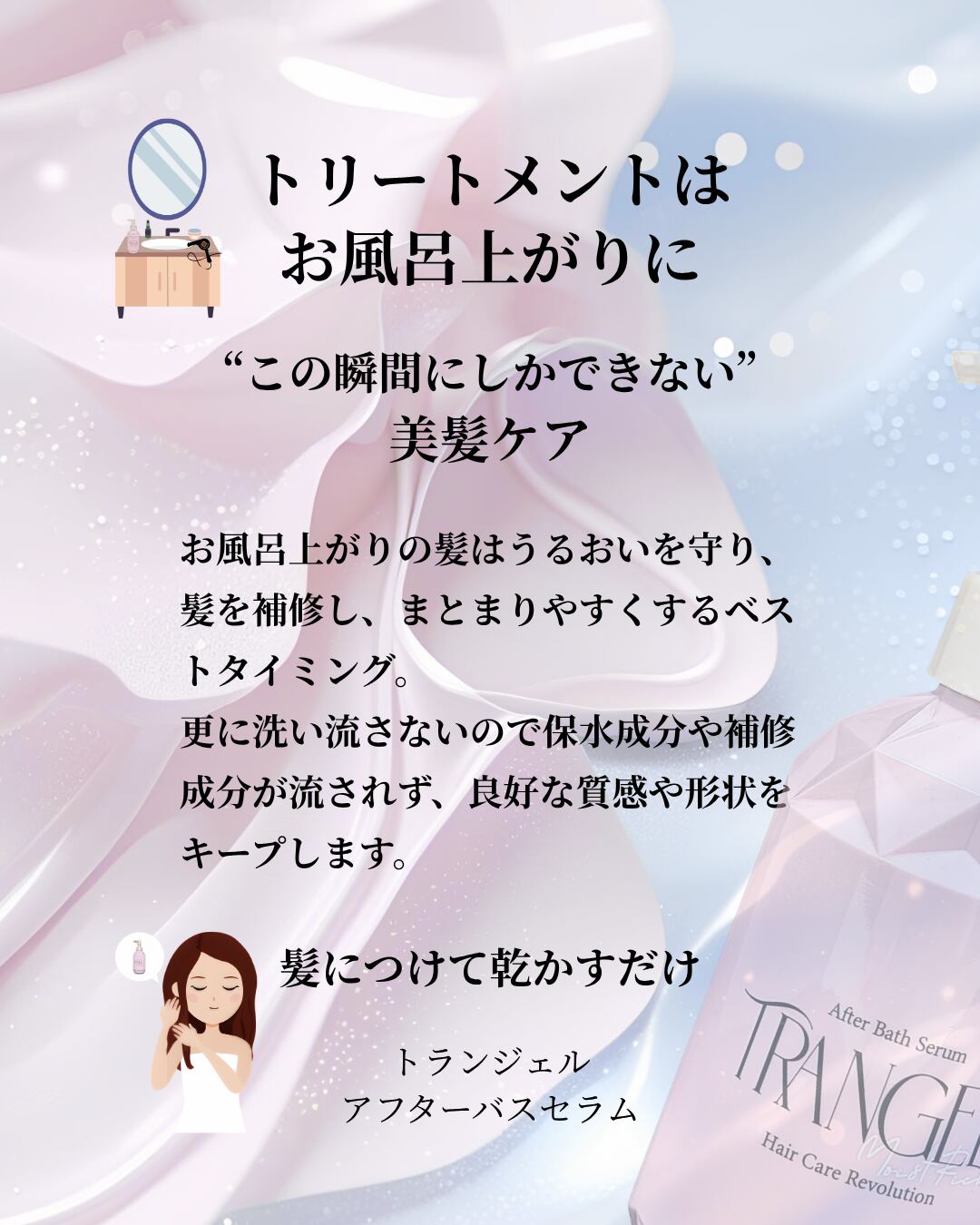 お風呂上がりの髪は水分を多く含みキューティクルが開いている為、髪の内側まで保水成分や補修成分が浸透しやすくなっています。この瞬間が髪のうるおいを保ちダメージを補修し、まとまりやすくなるベストなタイミング。